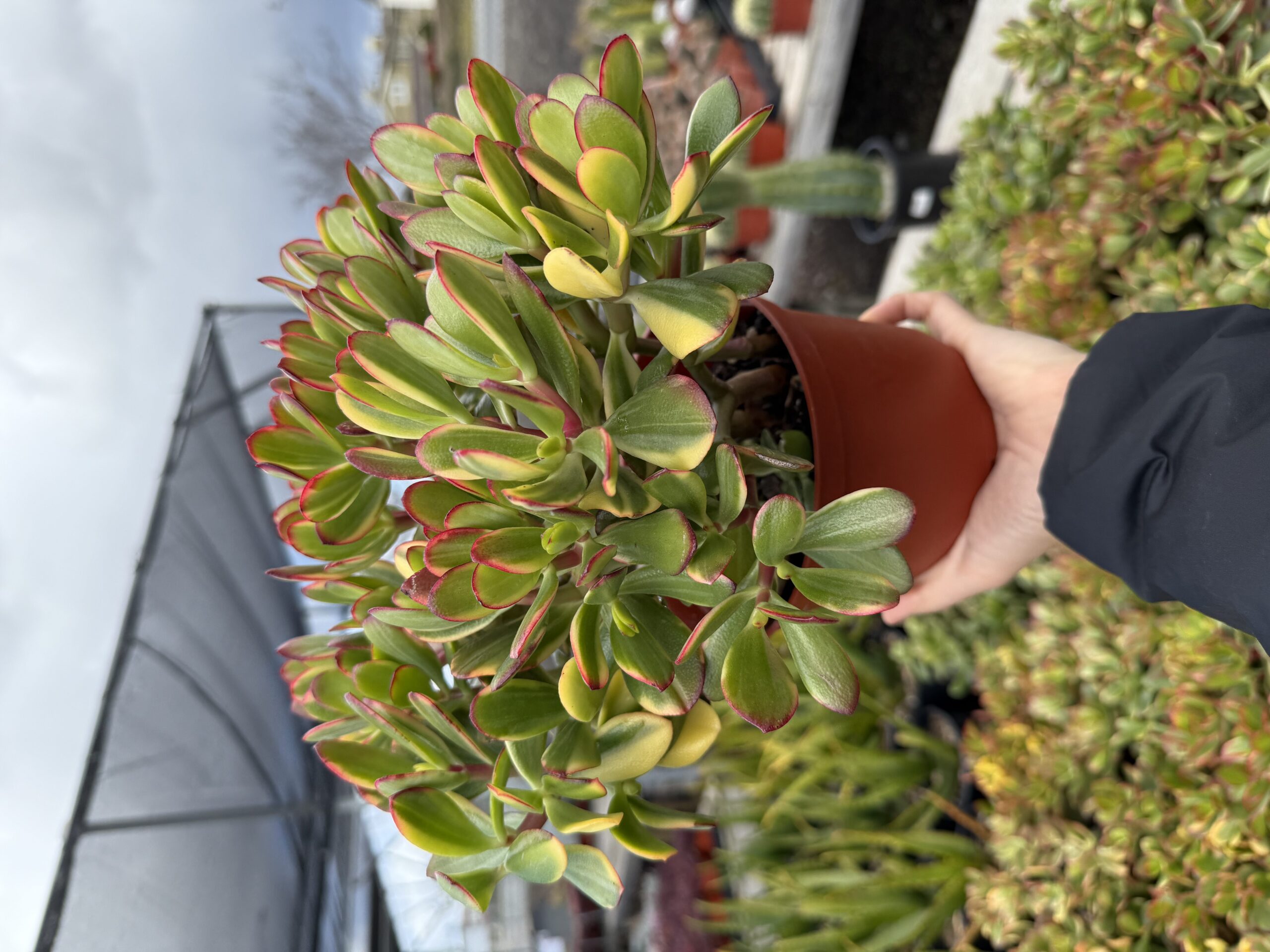 A mesmerizing succulent featuring vibrant tricolor leaves in shades of green, cream, and pink. This Crassula Ovata is a showstopper for both landscaping and retail displays, adding a pop of color and visual interest. Ideal for sunny spots with minimal watering needs.