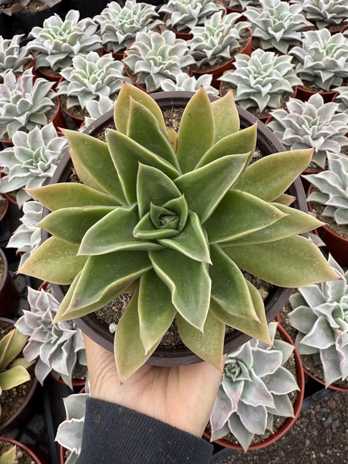 The Echeveria Agavoides Mexicana features compact rosettes with green, triangular, fleshy leaves tinged with red along the edges. Its striking colors and symmetrical form make it a standout choice for interiorscapes and retail displays. This plant requires infrequent watering and thrives in medium to bright light conditions, suitable for beginners looking for low-maintenance succulents.
