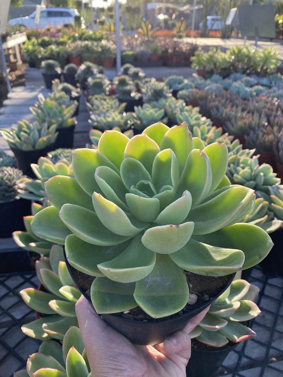 The Echeveria Palida showcases powdery blue-gray foliage in a rosette shape, adding a touch of elegance to landscapes and retail displays alike. With minimal water and light needs, this plant is suitable for interiorscapes and outdoor settings with filtered sunlight. Perfect for creating visually captivating arrangements.