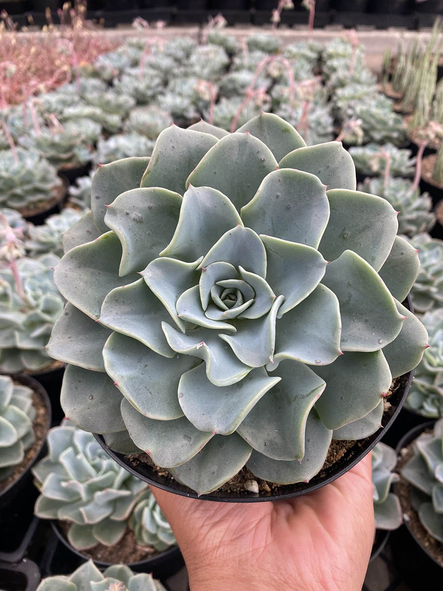 The 6″ Echeveria Swirls feature stunning rosettes with intricate patterns and hues, making them a must-have for both landscapers and garden centers. These plants are low-maintenance, requiring infrequent watering and bright light to flourish. Add a touch of elegance to indoor settings or retail displays with these popular succulents.