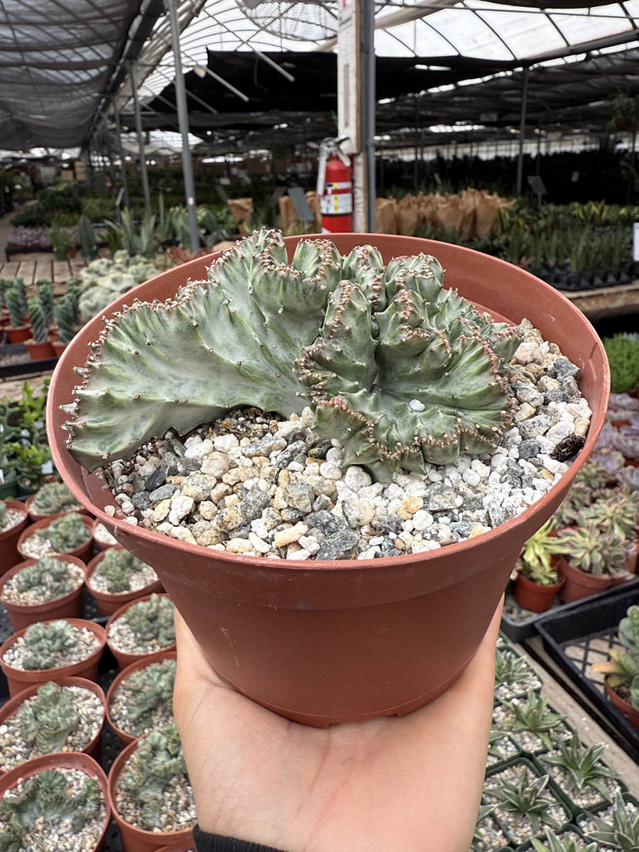 Euphorbia Lactea Crest, with its sculptural, cactus-like form and pale green color, brings a desert vibe to interiorscapes and retail shelves. This hardy plant thrives in bright light and requires minimal watering, ideal for beginners and professionals alike. Water: 1, Light: 3, General Care: 1