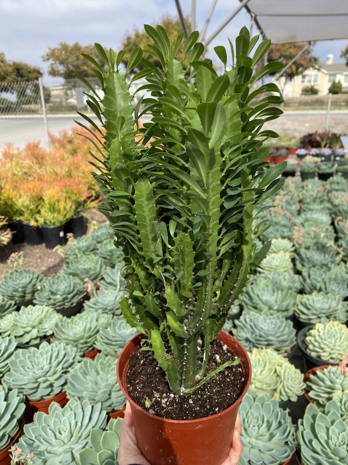 With its tall, columnar green stems and striking angular growth, the Euphorbia Trigona Green makes a bold statement in any landscape or retail setting. This eye-catching plant is low-maintenance and thrives in bright light conditions, making it an ideal choice for both experienced landscapers and retail garden centers. A must-have for creating visually dynamic displays.