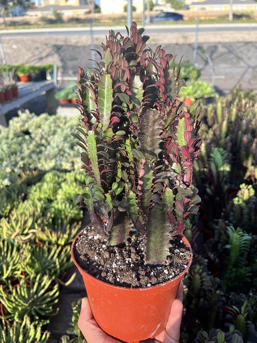 The Euphorbia Trigona Red showcases unique red stems with green leaves, adding a bold touch to any space. Suitable for indoor displays in retail areas, this plant thrives in bright light and occasional watering. With its easy-care requirements, it appeals to beginners and plant enthusiasts alike, making it a versatile choice.