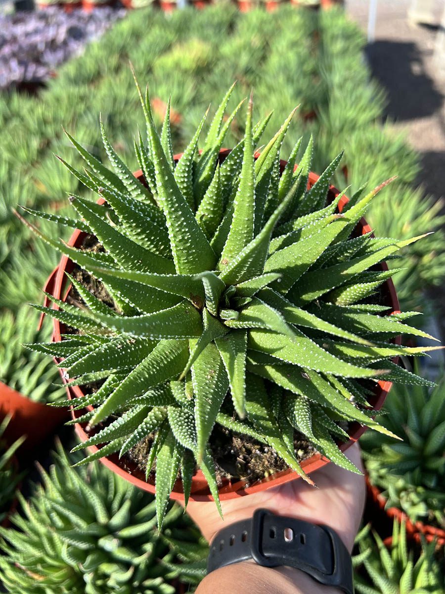 The 6″ Haworthia Faciata features compact rosettes of thick, dark green leaves adorned with white bands for a bold aesthetic. This plant is perfect for interiorscapes and retail displays, adding a touch of elegance. With minimal water needs and low light requirements, it’s an easy-care option suitable for beginners.