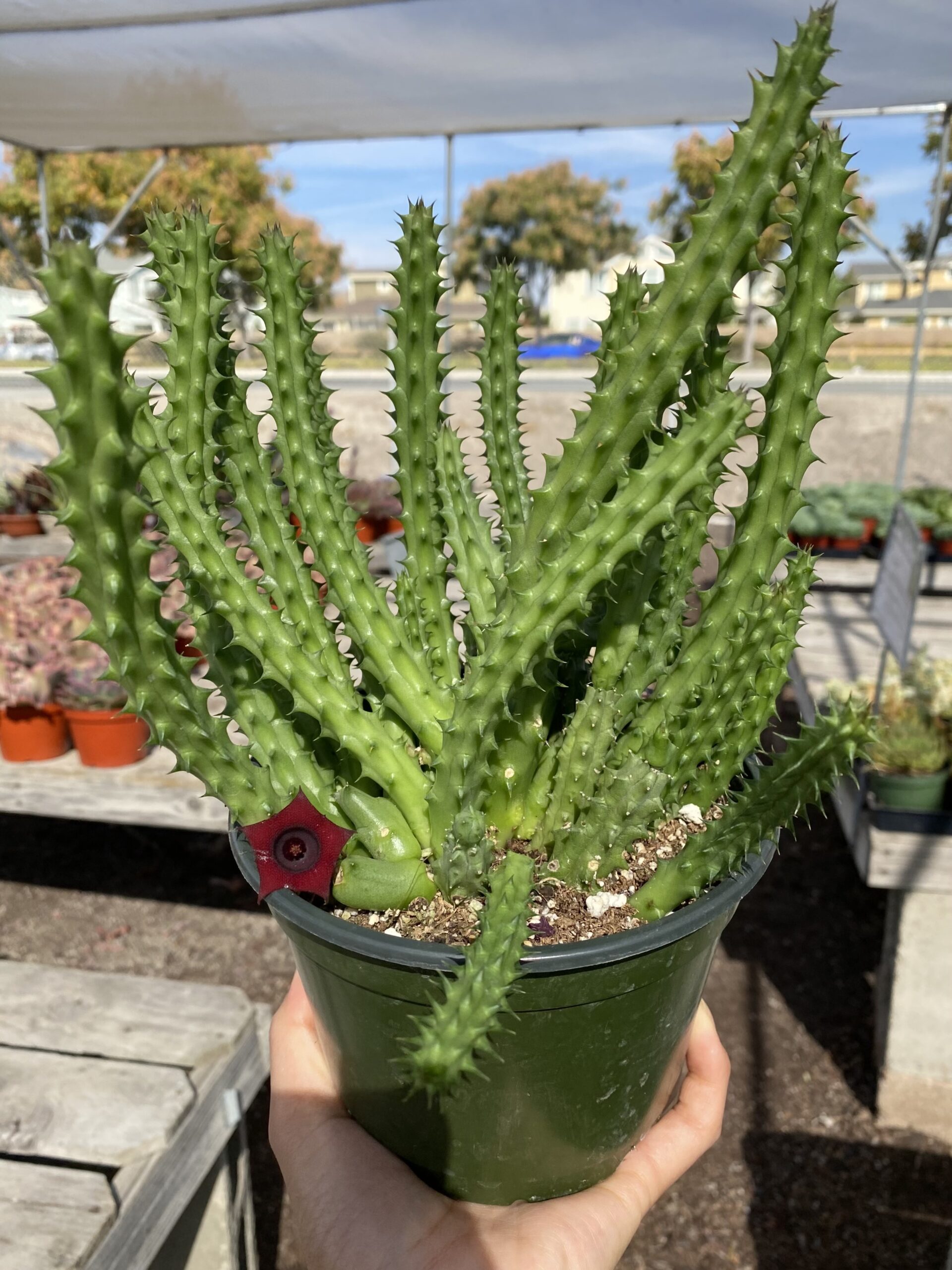 The 6″ Huernia Schneideriana features unique star-shaped flowers and succulent foliage, making it a standout choice for exterior landscapers and retail garden centers. With its low water requirements and adaptability to various light conditions, this plant is an easy-care option suitable for both professionals and enthusiasts. Ideal for adding exotic appeal to landscapes and drawing interest in retail displays.