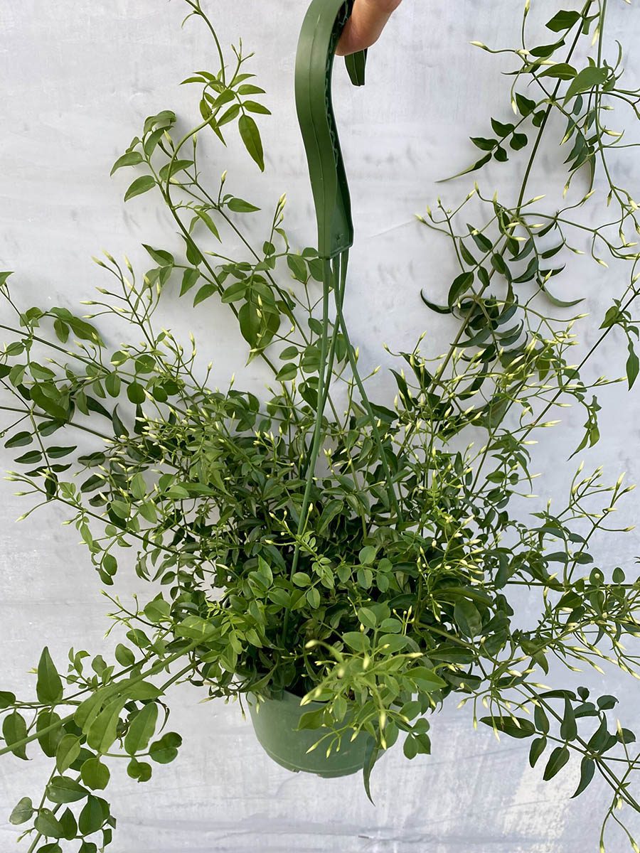 The Jasmine Hanging, Pink features cascading branches adorned with fragrant pink flowers, adding a touch of romance to interiorscapes and retail spaces. This plant thrives with frequent watering and bright light, making it perfect for enhancing visual appeal in various settings.
