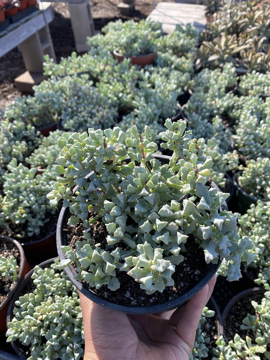 With silvery, triangular leaves that form a dense mat, the Oscularia Deltoides is a tough ground cover plant ideal for functional landscaping or creating visual interest in retail settings. This drought-tolerant beauty is perfect for adding texture and color to outdoor spaces. Water: 1, Light: 3, General Care: 1