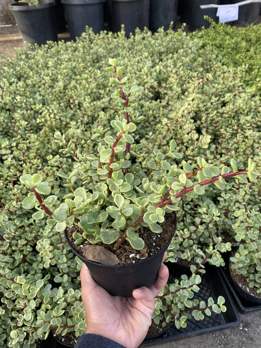 The Portulacaria Afra Variegated features charming variegated leaves in vibrant hues, adding a pop of color to any landscape. Perfect for both exterior landscapers and retail displays, this plant is drought-tolerant and low-maintenance, making it an excellent choice for various environments. Create stunning arrangements and eye-catching displays effortlessly.