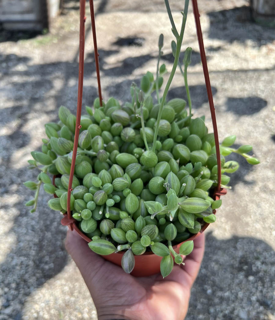 Senecio String of Watermelons features cascading vines with small, elongated leaves resembling watermelon rinds. Ideal for hanging displays, this succulent requires infrequent watering and medium light levels. Perfect for adding a unique touch to retail setups.