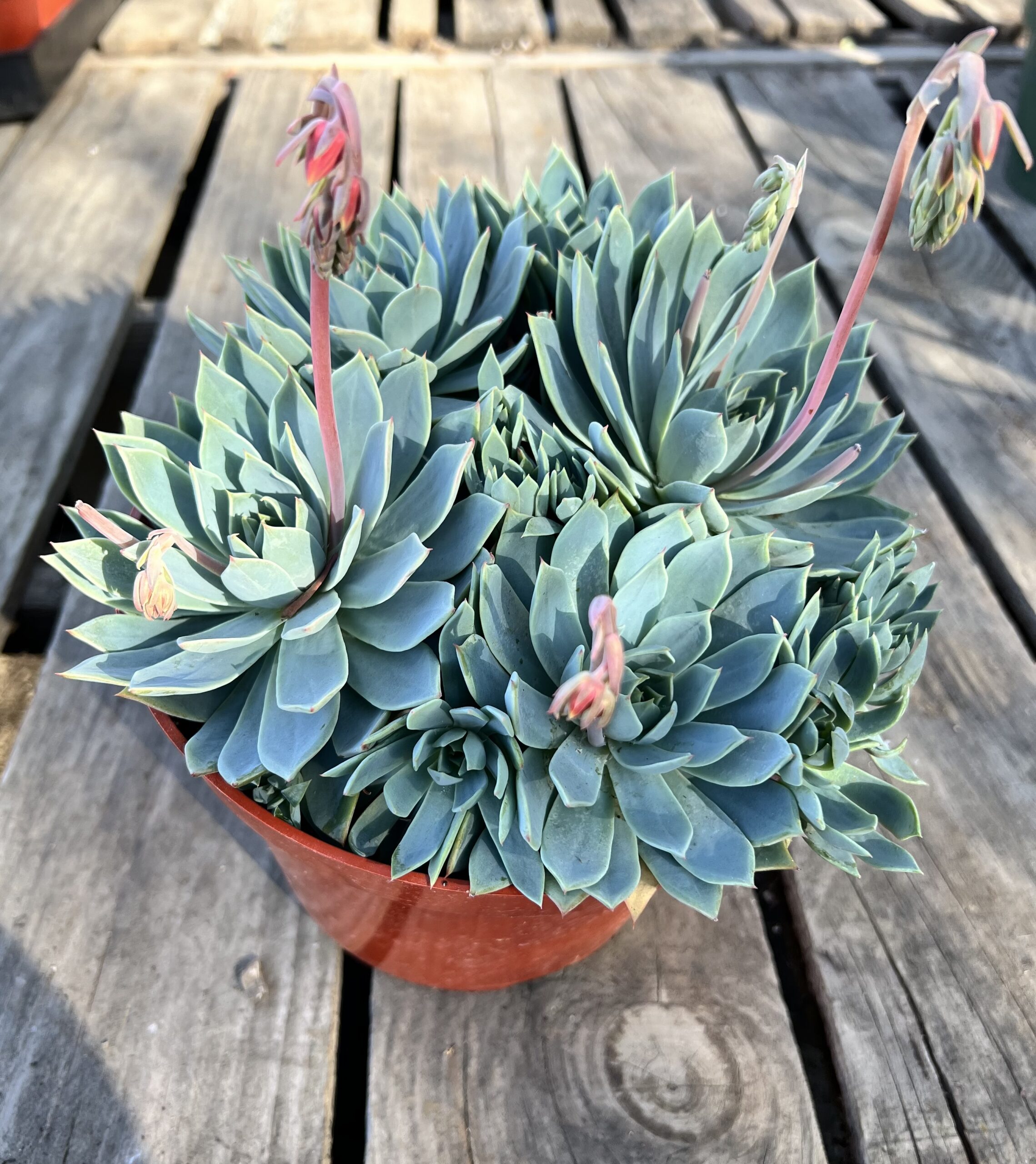 The 8″ Echeveria Secunda exhibits rosettes of fleshy, bluish-green leaves with delicate powdery coatings. Perfect for small containers or tabletop displays, this succulent thrives in moderate light conditions, adding a touch of elegance to interior settings and retail shelves. With easy-care needs and a charming appearance, it appeals to both beginners and gardening enthusiasts.